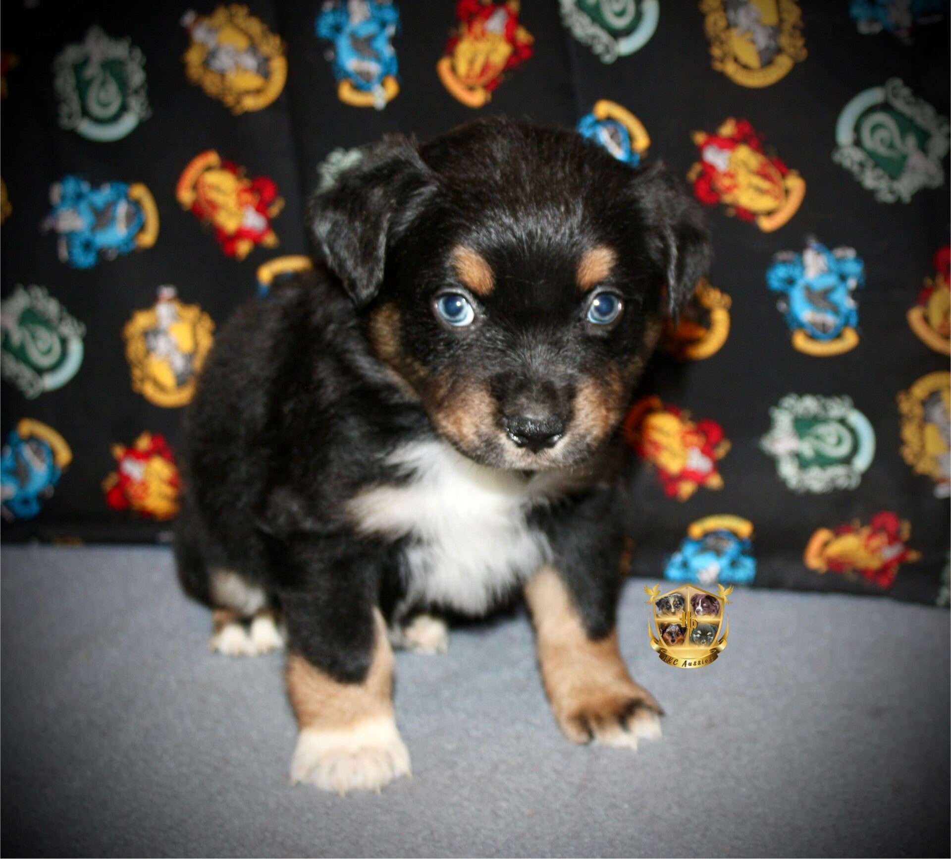 Reaper is one good looking black tri male! That copper on him is rich and dark. Reaper will have a partial blue eye. He is equally as sweet as he is playful. He would make a great on the go buddy or a family dog!