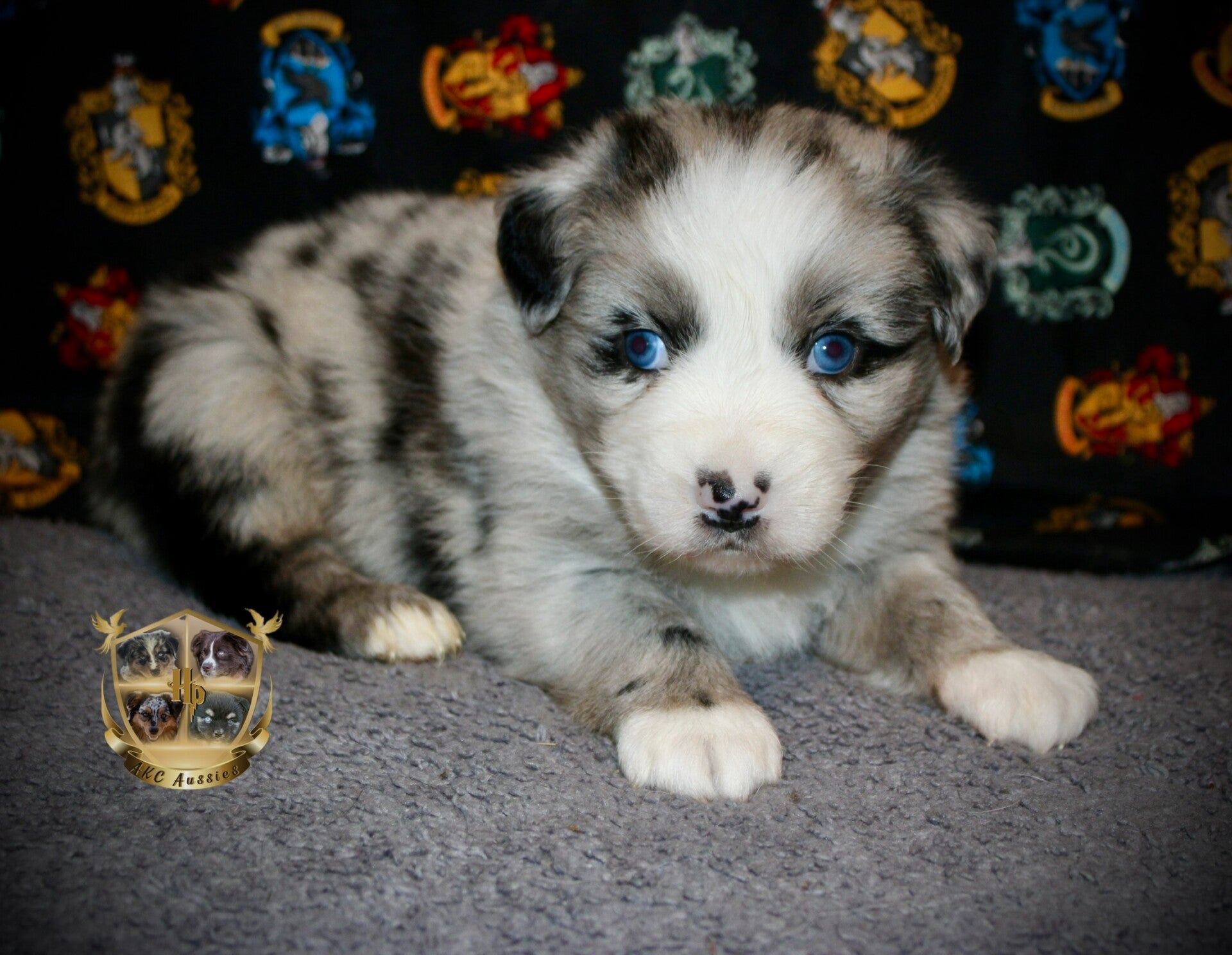 Frosty is a super handsome blue merle male with two blue eyes. He is a very classic looking Australian Shepherd and we love it! His personality is shining through in that he is confident and he is curious about everything!